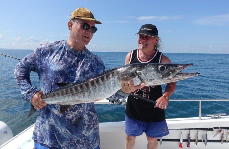 Po desáté opouštíme zónu ostrůvků a mělčin a míříme na oceán asi 15 km od ostrovů do zóny mělčin a podmořských kopců. Jigujeme na hloubkách 45-65 m, ale ryby zoufale nejdou, ačkoli je echolot ukazuje. Po hodině chytání jsem měl na udici jedinou metrovou makrelu, která se vypnula při podebírání u lodě. Zkoušíme jednu mělčinu po druhé, ale záběrů je málo. Až kolem třetí jsme na jednom podmořském kopci na hloubce kolem 40 m ulovili několik kaniců měsíčních 25-45 cm a dalších kaniců kolem 45 cm, metrovou barakudu a 65-centimetrového kranase žlutoskvrnného.