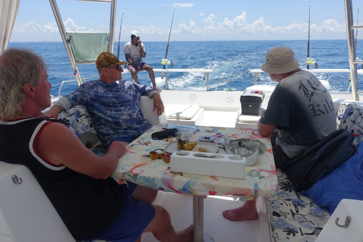 Protože chlapi jsou po třech dnech chytání unavení a nastává odliv, měníme taktiku a jedeme trolovat na rozhraní zátoky a oceánu, resp. do míst, kde se mísí čistá oceánská voda s kalnější vodou ze zátoky. Mysleli jsme, že cestou ulovíme nějaká nástražní bonita, ale ouha, žádná hejna rybek, natož bonit dnes nejsou vidět.
