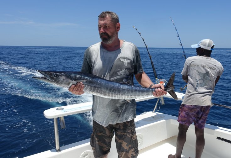 Nastražujeme tedy dvě bříška z bonita, která lodník připravil už včera, jeden wobbler a dvě hladinová dráždidla-chobotnice. Po chvilce máme záběr nevelké barakudy na hladinové dráždidlo, ale ryba padá dříve, než stačíme doběhnout k prutu. Asi o hodinu později přichází záběr na wobbler a Pavel se s rozvahou investora a tempem lenochoda vydává k prutu, aby pěkně v klidu zdolal wahoo (makrela Solandrova) 111 cm. Po hodince přichází záběr opět na hladinovou nástrahu, opět je to asi metrové wahoo, ale ačkoli Ruda vypálil k prutu jako blesk, ryba po pár vteřinách zdolávání padá. Pak si dáváme oběd, kávičku, ale tím veškerá aktivita na palubě končí, další záběr nepřichází. Je odliv, hladina oceánu klidná, nikde žádná hejna rybek, nikde ptáci, kteří by signalizovali přítomnost hejn ryb. Protože nám zbývá více než hodina rychlé jízdy na kotviště v zátoce baobabů, rozhodujeme se, že pojedeme směrem do zátoky a když narazíme na hejno rybek nebo nějaké pěkné místo, zkusíme chvíli vláčet. Cestou jsme měli jeden útes, který vystupuje asi pět metrů pod hladinu a narazili jsme na jedno hejno 20-centimetrových sardinek, ale kromě jedné podseklé sardinky jsme žádný úspěch nezaznamenali. Ale u hejna sardinek jsme pod hladinou pozorovali obrovskou, snad čtyřmetrovou mantu, která filtrovala vodu kolem hejna.