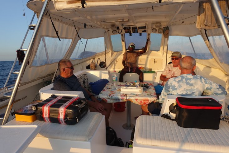 Protože jsme večer šli spát už po deváté, budíme se ještě před východem slunce krátce po páté. Je krásné svěží ráno, asi 25°C a skoro bezvětří. Na hladině zátoky už je několik pirog z okolních rybářských osad. Stejně jako včera je i dnes úplně jasno a tak zahajujeme den mazáním krémem proti slunci. Následuje snídaně a v 7.00 nastupujeme na rybářskou loď a vyplouváme. Mateřská loď dnes zůstane na kotvišti v zátoce. Takže budeme rybařit v okolí mysu San Sebastian a večer se vrátíme zpět.