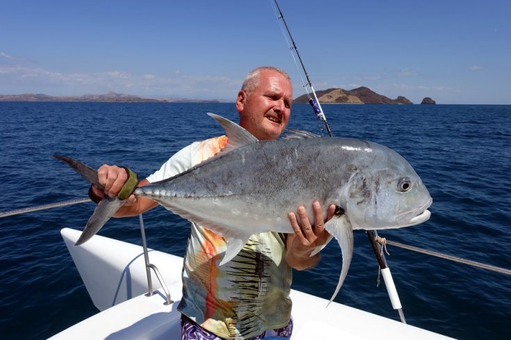 Ráno vláčíme kolem sopečných útesů v okruhu do 5 km od myslu San Sebastian. Všude jsou hejna rybek, na nástrahy nám útočí hlavně jehlice, ale ulovili jsme i dva kranasy obrovské-GT 88 cm a jednu makrelu 98 cm. V 10.00, když je minimální odliv, tak opouštíme zónu útesů a jedeme asi 30 minut na severozápad, na hranu hloubek 40-80 m, kde chceme jigovat. Začíná však zlobit levý motor a tak v 10.30 zastavujeme na zlomu 30-40 m a zatímco jigujeme, tak lodník mění svíčky v tom vynechávajícím motoru. Luboš ulovil na jig jednu půlmetrovou makrelu nebo co to bylo. Jenže po výměně svíček už se ten levý motor nepodařilo nahodit. Bohužel nebyl signál na mobil a tak jsme na jeden motor museli dojet k pobřeží, tam si kapitán zavolal mechanikovi pro instrukce a během hodiny, když se podařilo vyloučit problémy se svíčkami, baterkou, startérem, elektrikou a přívodem paliva do motoru, se vyjasnilo, že odešla palivová pumpa. Náhradní pumpu jsme sice na palubě měli, ale vyměnit ji na moři není úplně jednoduché. A tak jsme s jedním motorem objeli několik ostrovů a útesů, kde jsme zkoušeli vláčet. Pár záběrů od kranasů a makrel bylo, Libor utrhnul velkou rybu, která mu zajela do korálů, ale ulovit se nám již nic nepodařilo.