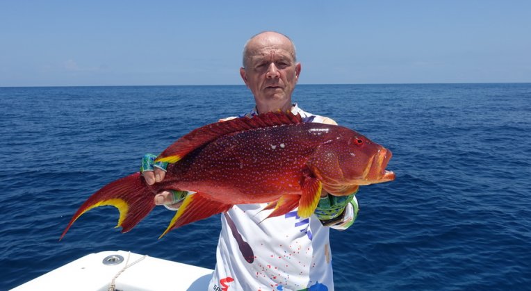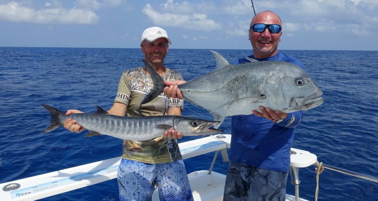 Lovené druhy rybKranas obrovský (GT, 1-50 kg), kranas modroploutvý (bluefin, 1-15 kg), kranas velkooký (horseeye jack, 1-15 kg), kranas papuánský (yellowfin jack, 1-15 kg), kranas žlutoskvrnný (spotted trevally, 1-25 kg) kranas duhový (rainbow-runner, 1-10 kg), kanici (1-50 kg), chňapali (snapper, 0,5-20 kg), jehlice (garrfish, 1-5 kg), makrela Solandrova (wahoo, 5-20 kg), makrela Commersonova (king mackerel, 2-35 kg), zlak nachový – koryféna (2-15 kg), barakuda (1-30 kg), tuňák nepravý-bonito (0,5-3 kg), tuňáci (5-100 kg), rejnok (od 5 kg), žralok (od 2 kg), plachetník (20-60 kg), mečoun (od 20 kg), smuhy (1-5 kg), korálové ryby (čtverzubci, cejnovky, pyskouni, ostenci, bodloci, pruhatci, chrochtalove...).