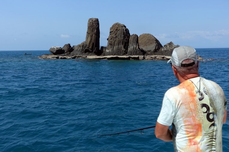 Daří se nám ulovit několik téměř metrových makrel a pár jehlic od metru do 134 cm. Byly i opakované výjezdy hejnek kranasů, ale nástrahy nedobíraly nebo se nám je nedařilo zaseknout nebo po záseku během zdolávání spadli. Většinou to byli kranásci 50-65 cm, ale měli jsme na udici i kranasy k metru délky. Čím dál větší problém byl sílící vítr, který dělal na šňůře pytel, případně znemožňoval přesné náhozy. Během dne se přesouváme k souostroví Miotsio a vláčíme kolem sopečných ostrůvků a útesů. Břehy některých tvoří ukázkové čedičové varhany, jinde jsou pláže s pásem kamení nebo s korálovým útesem. Největší aktivita ryb je mezi cca 11.00-15.00, tedy za rostoucího přílivu, ale po 16.00, když hladina opět klesá, tak klesá i aktivita ryb a navíc i zesiluje vítr, který činí rybaření technicky dost složitým.