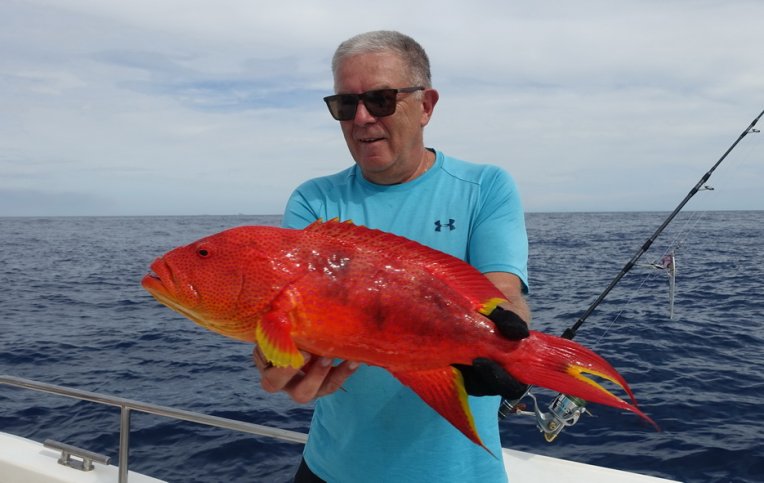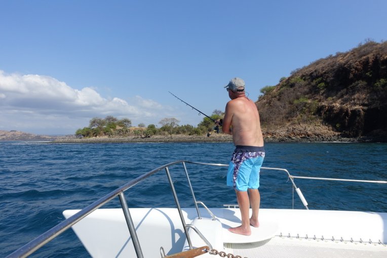 Ráno vláčíme kolem sopečných útesů v okruhu do 5 km od myslu San Sebastian. Všude jsou hejna rybek, na nástrahy nám útočí hlavně jehlice, ale ulovili jsme i dva kranasy obrovské-GT 87 a 88 cm a jednu makrelu 98 cm. V 10.00, když je minimální odliv, tak opouštíme zónu útesů a jedeme asi 30 minut na severozápad, na hranu hloubek 40-80 m, kde chceme jigovat. Začíná však zlobit levý motor a tak v 10.30 zastavujeme na zlomu 30-40 m a zatímco jigujeme, tak lodník mění svíčky v tom vynechávajícím motoru. Luboš ulovil na jig jednu půlmetrovou makrelu nebo co to bylo. Jenže po výměně svíček už se ten levý motor nepodařilo nahodit. Bohužel na oceánu nebyl signál na mobil a tak jsme na jeden motor museli dojet k pobřeží, tam si kapitán zavolal mechanikovi pro instrukce a během hodiny, když se podařilo vyloučit problémy se svíčkami, baterkou, startérem, elektrikou a přívodem paliva do motoru, se vyjasnilo, že odešla palivová pumpa. Náhradní pumpu jsme sice na palubě měli, ale vyměnit ji na moři není úplně jednoduché. A tak jsme s jedním motorem objeli pár ostrovů a útesů, kde jsme zkoušeli vláčet. Několik záběrů od kranasů a makrel bylo, Libor utrhnul velkou rybu, která mu zajela do korálů, ale ulovit se nám již nic nepodařilo.