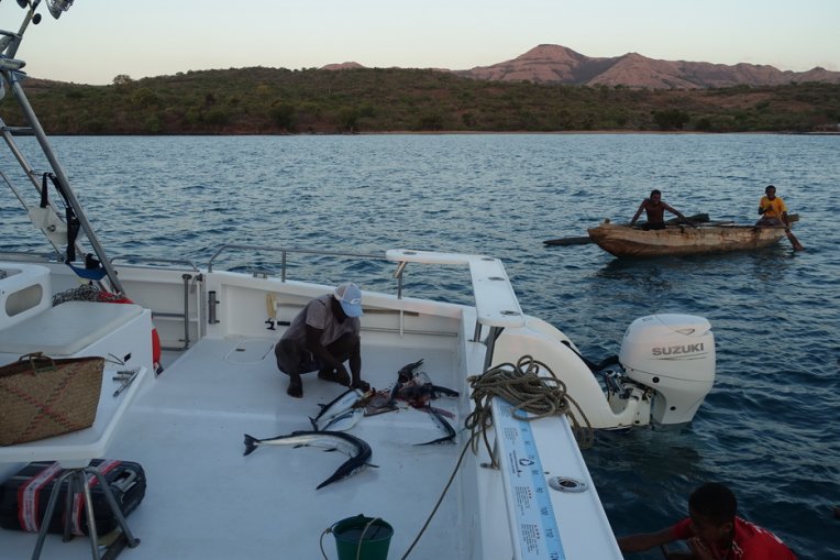 V sedm ráno jsme po snídani, opouštíme obytnou loď a na rybářské lodi vyplouváme k východu za dalším rybářský dobrodružstvím. Zatímco nás dnes čeká závěrečný den rybaření, obytná loď se přesune na kotviště u ostrova Nosy Be, kde naše putování severním pobřežím Madagaskaru skončí. Ještě jsme ani neopustili kotevní zátoku ostrova Mitsio, když se objevila hejna bonit. Protože hladina moře bude dnes vlivem východního větru hodně zvlněná, chceme se několik hodin věnovat trollingu a nástražní bonito na mečouna by se nám hodilo. Vláčíme tedy malé wobblery a jigy v hejnech bonit, ale daří se nám lovit jen relativně velká bonita 60-75 cm. Po ulovení třetího bonita přestáváme jejich hejna honit a vyrážíme na oceán. Lodník Evariste během plavby z ulovených bonit seřezává bříška, která našívá na hladinové nástrahy-chobotničky, aby z nich učinil neodolatelnou nástrahu pro plachetníka nebo mečouna.