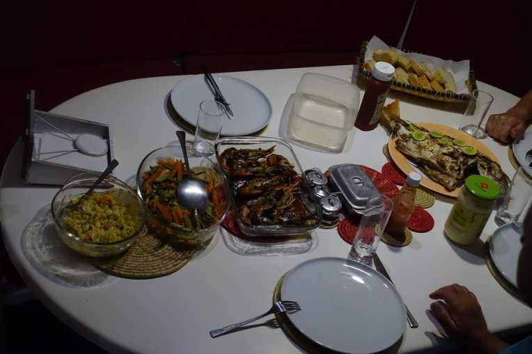 K večeři bylo vynikající carpaccio z makely, kuřata v kreolské omáčce s hranolkama a salátem, no a samozřejmě pár lahví THB a několik kubíčků (rum s colou a limetkou) na dobrou noc.