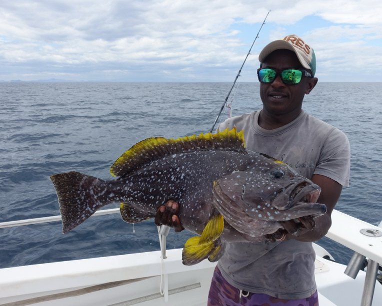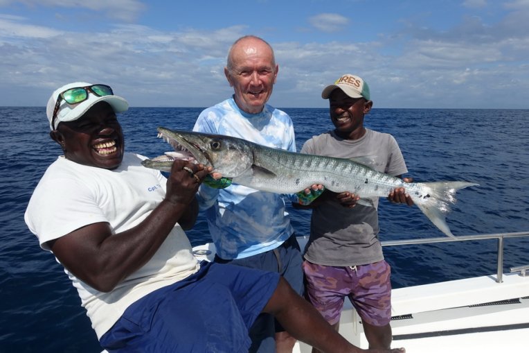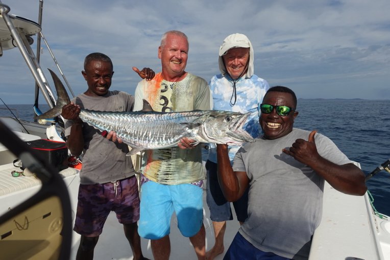 Asi dvě hodiny jsme vláčeli kolem ostrůvků a útesů a chytali jsme kranasy obrovské-GT 60-80 cm, makrely Commersonovy 80-90 cm a jehlice. Následně jsme se se přesunuli k ostrovu Nosy Lava, cestou jsme naháněli hejna bonit, ale chytli jsme jen dvě 65 a 75 cm. U skalnatého pobřeží ostrova Nosy Lava jsme chytli dva kranasy obrovské-GT 70 cm a spadlo nám pár menších kranasů.