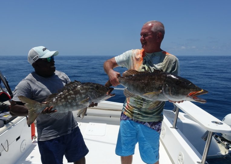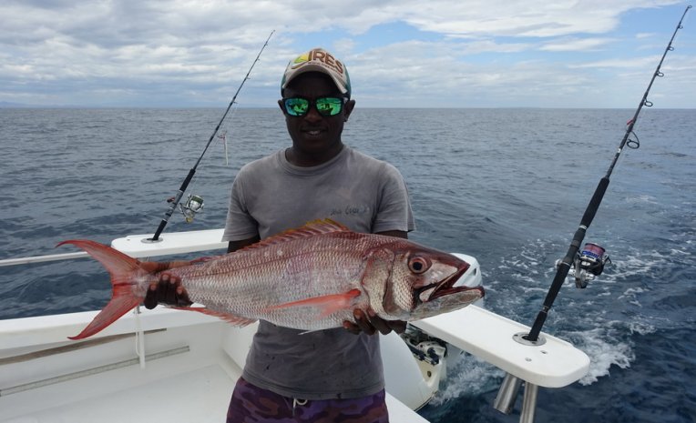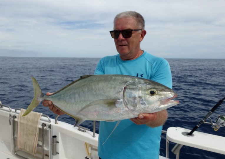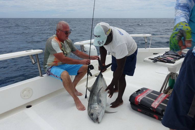 Kapitán nervózně sleduje prázdnou obrazovku echolotu a dvě rybářské lodě, které nás míjejí a míří dál na oceán. Následně nařizuje změnu loviště a valíme další skoro hodinu rychlé jízdy na sousední soustavu mělčin 20-40 m, za kterou klesají hloubky do 300 m a tam konečně přicházejí první záběry. Nejprve malé cejnovky a kanici kolem 30 cm, pak metrový žralok hedvábný, který zřejmě během zdolávání zaútočil na malého kanice. Následuje první kanic žlutoploutvý 55 cm, chňapali růžoví 60-80 cm, chňapali velcí kolem 60 cm, pak kanic žlutoploutvý 68 cm, kranas obrovský-GT 88 cm, barakuda 130 cm. A k tomu samozřejmě pár ukousnutých nebo utržených jigů, ale někteří chytáme celý den na jeden 80-gramový jig. Vše chytáme na hloubkách 40-80 m na jigy 80-200 g. Zatímco dopoledne byla nejnižší hladina odlivu, odpolední příliv vrcholí v 18.00 a tak vlastně celé odpoledne chytáme za rostoucího přílivu, ale na aktivitě ryb to není nijak znát.