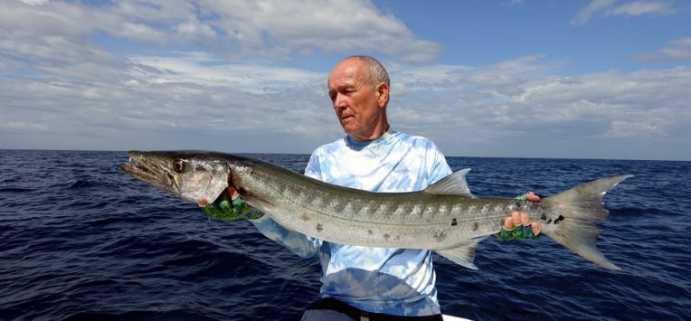 Na volné vodě jsou nejméně dvoumetrové vlny s pěknými bílými čepicemi. Plavba je sice bezpečná, ale pohodlně se dá jet jen po vlnách. O nějakém jigování nebo přívlači nemůže být zatím ani řeči, na to je příliš silný vítr a velké vlny. Nastražujeme celkem šest trolovacích prutů kategorie 50-80 liber. Dva vnější 80-liberní s velkou hladinovou chobotnicí na outriggerech asi 60 m za lodí, středové pruty s chobotnicemi s našitým bříškem asi 40 m a lodí a vnitřní pruty s nejlehčím navijákem/prutem s chobotnicemi s našitým bříškem na trhací karabině jen cca 15-20 m za lodí. Trolujeme rychlostí 7 uzlů šikmo po vlnách směr jihozápad. Po třech hodinách trollingu jsme měli ulovené dvě 80-centimetrové barakudy a jinak ani záběr.