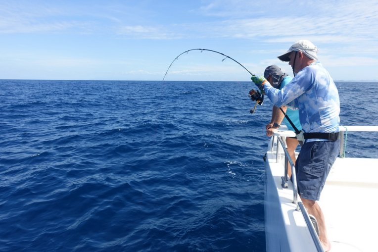 Po cca hodině rychlé jízdy připlouváme do zóny podmořských kopců a útesů. Objevují se hejna bonit, kolem kterých zkoušíme vláčet. Pro bonita jsou naše nástrahy velké, ale občas máme záběry jehlic nebo makrel. Čerstvý větřík je sice příjemný, co se teploty týče, ale na druhou stranu komplikuje kontakt s nástrahou a tak se nám drtivou většinu ryb nedaří zaseknout nebo nám po záseku z udice padají. Asi po hodině nahánění bonit měníme stanoviště a vláčíme kolem korálových útesů.