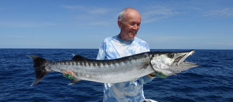 Protože se v poledne vítr a následně oceán trochu uklidnil, volíme změnu rybolovné techniky a začínáme jigovat na zlomech hloubek 40-80 m. To už se blíží poledne, hladina odlivu je na minimu a ryby zoufale neberou. Ačkoli kapitán každou chvíli hlásí, že echolot ukazuje u dna ryby, jsme přes hodinu bez záběru. Měníme tedy taktiku a vyhlašujem pauzu na oběd. Snad zatím ryby pochopí, že by se také měly pustit do jídla. A pochopily! Hned po obědě přichází jeden záběr za druhým. Na palubě se postupně objevuje malý chňapal růžový, kranas obrovský-GT 70 cm, kranas žlutoskvrnný 65 cm, asi tucet malých barakud 60-85 cm a Saša trumfuje velkou barakudou 125 cm. Protože je u dna docela silný proud, používáme trochu těžší nástrahy než v předchozích dnech, tedy jigy 150-250 g.