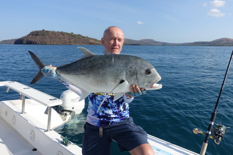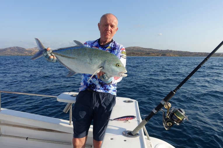 Před sedmou jedeme vláčet do okolí sopečných ostrůvků. Na hladině jsou hejnka rybek, kolem kterých čekáme úlovky kranasů. Ale není to žádná hitparáda, jen u každého třetího nebo čtvrtého hejna máme záběr nebo uloveného kranase obrovského-GT 85 cm a Liborovi se povedl kranas papuánský 65 cm. Chytáme i na místech, kde je asi 5-7 m hloubka, krásné korálové dno a proud, který jde přes hranu do větší hloubky. Tam jsme měli pár záběrů od makrel, ale žádnou se nepodařilo zaseknout, jen jedna mi ukousla úplně nový jerk.