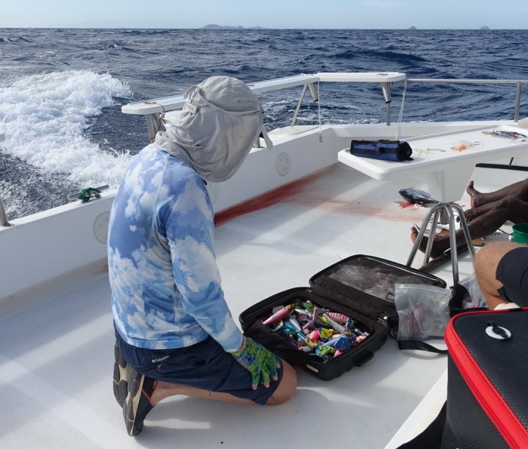 Na obytné lodi snídáme, sestavujeme udice a po hodince přestupujeme na rybářský katamarán. Každý máme připravený jeden prut na vertikální přívlač, druhý prut na lehčí hladinovou přívlač s nástrahami 30-80 g a třetí prut na těžkou hladinovou přívlač – popping kalibru 90-200 g.