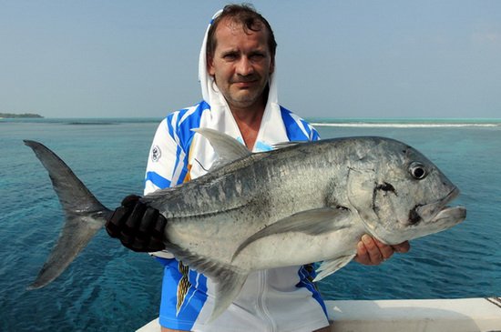 Celý den jasno až oblačno, ráno bezvětří a později přes den jen mírný větřík. Chytali jsme dopoledne na poppy uvnitř severozápadní části atolu a odpoledne pak na trolling a na jigy na západní straně atolu. Na poppy jen několik kranasů GT a bluefinů. Tím, že bylo skoro bezvětří a navíc ještě odliv, tak ráno ryby nešly skoro vůbec a až když se blížilo poledne a nastupoval příliv, tak se ryby objevovaly trochu častěji, ale i podle jejich chování je vidět, že jsme blízko města N a míst, kam zajíždějí rybáři z resortů – ryby jsou zde ochytané.Přes poledne šnorchlujeme a pak obědváme u ostrůvku u města N, kde se z jižní strany dá zajet s lodí až těsně k ostrůvku a kotvit na svažité písčině obklopené nádhernými korály se spoustou ryb.